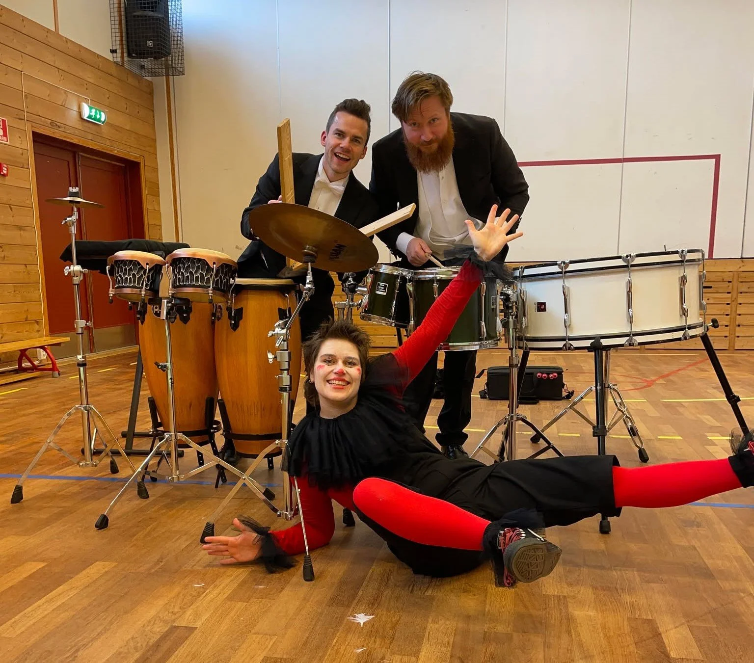 Velkommen til en leken konsertopplevelse litt utenom det vanlige! Det er Slagverkduoen, Kaksi, som endelig skal ha konsert. Instrumentene er rigget og pusset, de har tatt på seg sin fineste stas og alt er klart … eller hva er det som står på scenegulvet der? Kan noen flytte den stigen? Hjelpen er rett rundt hjørnet, eller rett bak teppet … klovnen Marie er alltid beredt, i det hun trer inn på scenen åpner det seg et nonverbalt, uhøytidelig og varmt møte mellom fysisk komedie og slagverk.